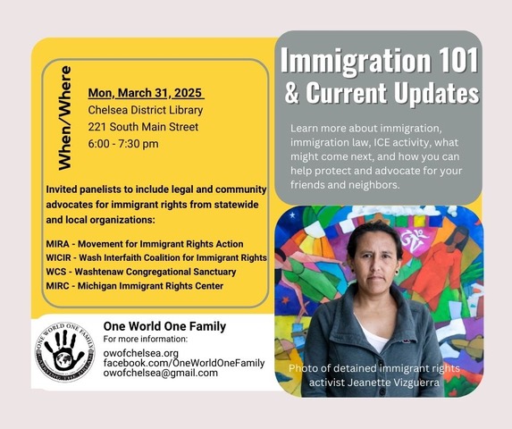 OWOF will host an opportunity to learn more about the current status of immigration, including the basics of immigration law and the court process, the rules of enforcement and ICE activity, and what might come next. The panel discussion will include legal and community advocates from state and local immigrant rights organizations. It will a good time to learn and understand what’s involved and how local residents can help protect and advocate for people in our communities who came to America for a better life.